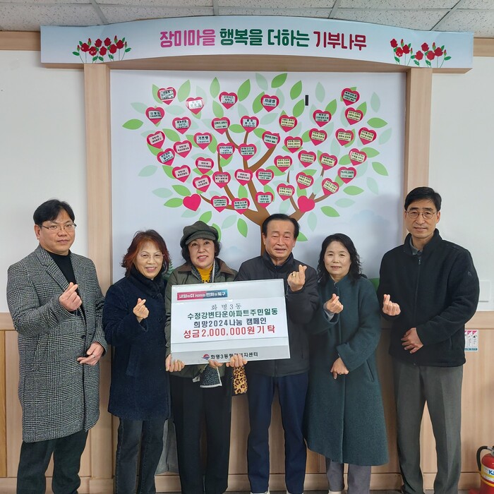 [로컬세계 부산=김의준 기자]부산 북구 화명3동 행정복지센터는 수정강변타운 아파트 입주민들이 어려운 이웃들에게 따뜻한 사랑을 전하고자 이웃돕기 성금 200만원을 전달했다고 11일 밝혔다.