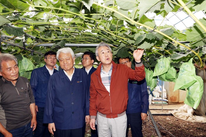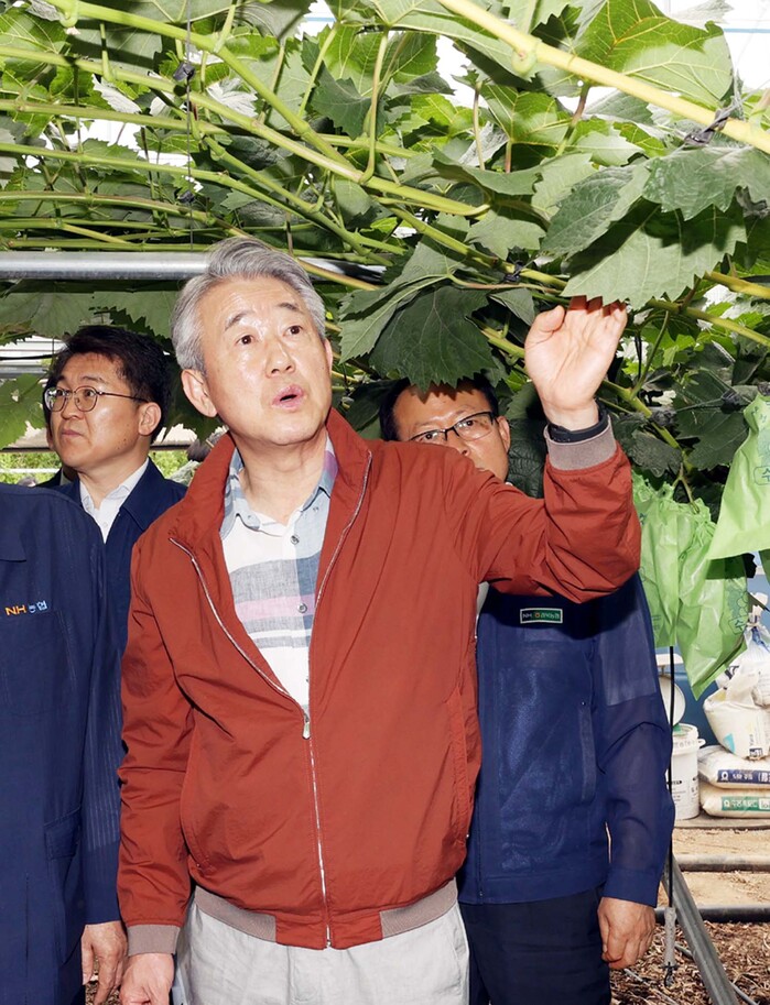 ▲ 강호동 농협중앙회장이 경북 영천시 소재 포도 재배농가를 방문하여 생육동향을 점검하고 있다. 농협 제공