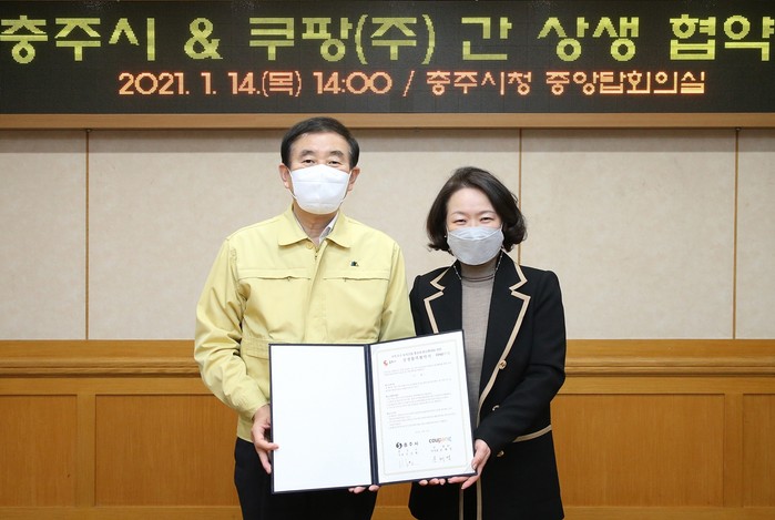 | ▲윤혜영쿠팡 리테일 부사장(사진 오른쪽)과 조길형 충주시장이 14일 충주시청에서 ‘지역 우수 농특산품 홍보와 판로확대를 위한 업무협약(MOU)’을 체결했다. |