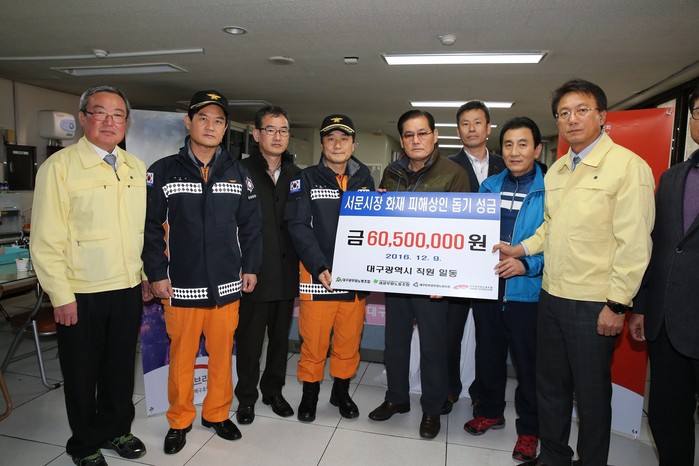 성금기탁에는 정명섭 재난안전실장, 전재경 대구시 자치행정국장과 생활안전을 총괄하는 남화영 대구소방본부장이 참석했으며 시 직원을 대표해 김영진 대구공무원노동조합 사무총장, 권기환 새공무원노동조합 위원장, 김성력 대구민주공무원노동조합 위원장이 작지만 따뜻한 온정을 전달했다.