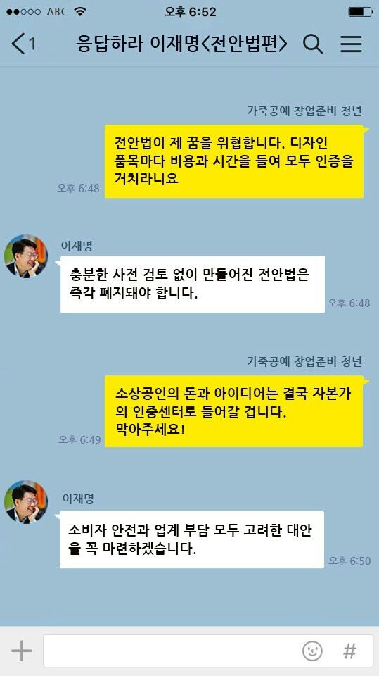 한편 이재명 후보 SNS콜센터에 30대 창업준비생은 "품목마다 색상마다 원단마다 인증을 받아야 하는 법안은 저에게는 아무 것도 하지 말라는 뜻과 같다"면서 "인증 비용은 천문학적으로 높아지고 인증 절차는 하루하루의 매출에 직격탄을 놓을 것"이라고 했다.