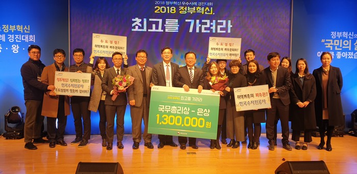 | ▲지난 3일 행정안전부의 ‘2018 정부혁신 우수사례 경진대회’에서 국무총리상(은상)을 받은 수자원공사가 다른 수상자들과 기념사진을 찍고 있다.(수자원공사 제공) |