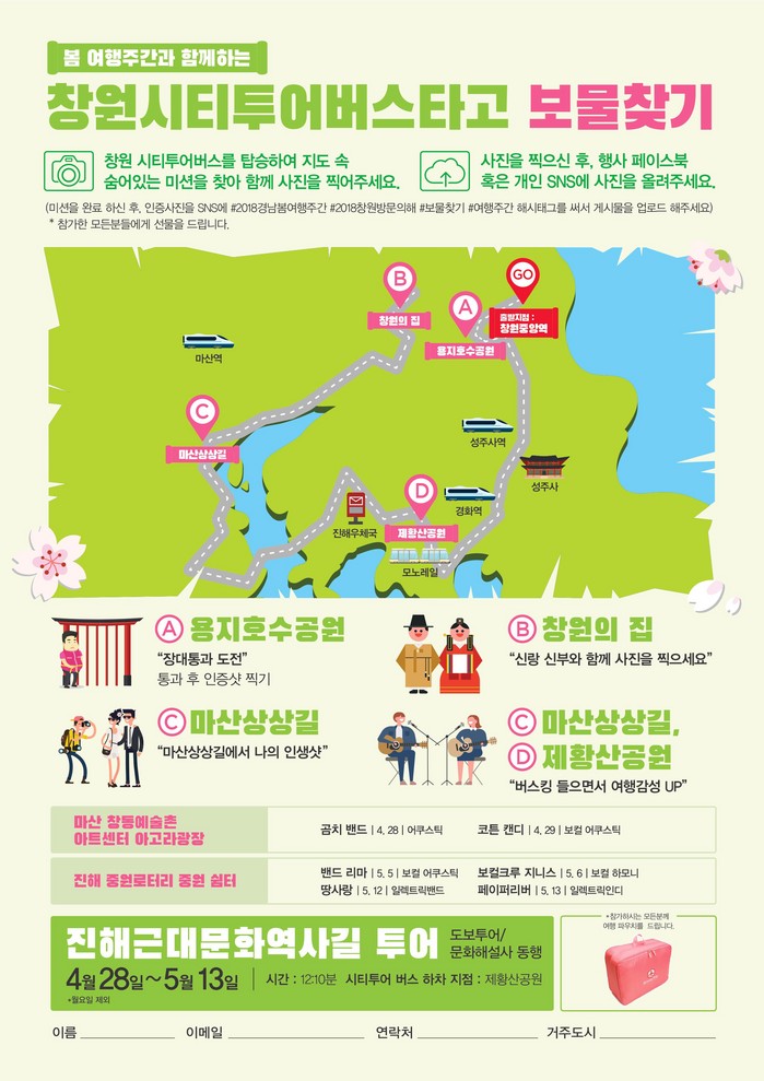 덧붙여 “봄 여행주간이 시작되는 28일에는 비음산 철쭉제도 개최된다”며 “봄바람 휘날리는 창원에서 시티투어와 함께 봄꽃의 향연에 빠져 보고, 잊지 못할 추억도 많이 남기길 바란다”고 전했다.