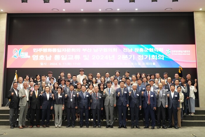 11일 그랜드모먼트 유스호스텔 오페라홀에서 개최된 통일교류식 및 합동정기회의에는 박종헌 부산남구협의회장, 백광준 장흥군협의회장, 오은택 남구청장, 김성 장흥군수, 박미순 남구의회 의장, 왕윤채 장흥군의회 의장 등 100여명의 양측 자문위원이 참석했다.