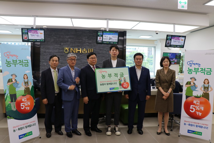 농협 서울지역본부(본부장 이대엽)는 20일 송파농협 본점에서 안호근 상호금융사업지원본부장, 이한종 송파농협 조합장과 함께 새내기 농부들의 목돈 마련을 위한 고금리 상품인 '함께하는 농부 적금' 가입행사를 열었다.