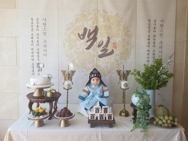 ▲ 대구 수성구가 저출산 문제 극복을 위해 운영하는 ‘찰칵! 가족의 탄생 축하기념’ 사업의 백일상과 돌상 샘플 사진. 수성구 제공 |