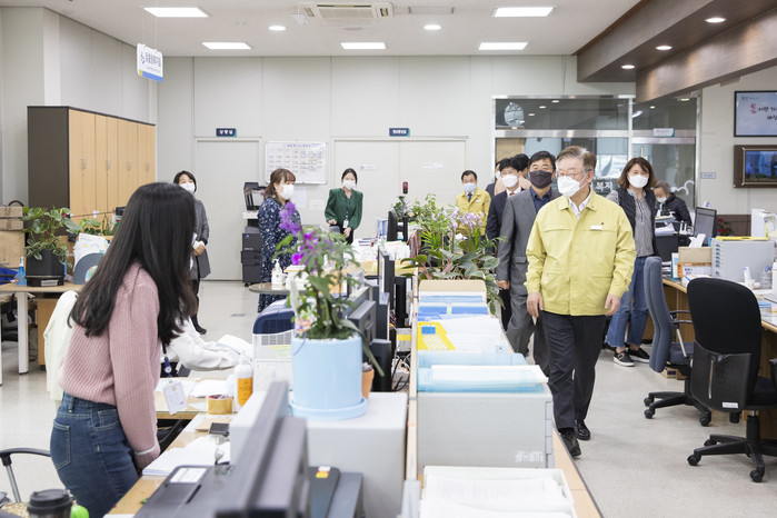 [로컬세계 고기훈 기자]이재명 경기도지사가 16일 오후 ‘경기 극저신용대출’ 접수 현장인 화서2동 행정복지센터를 찾아 직원들을 격려하고 원활한 사업 진행을 위해 신용대출사업 수행기관 관계자들과 의견을 나눴다.