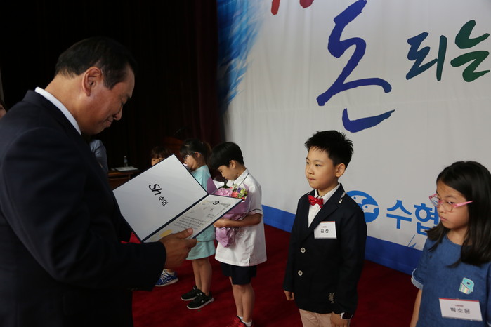 | ▲20일 서울 송파구 수협중앙회 본사에서 진행된 '2018년 바다사랑 초등학생 문예 공모전 시상식'에서 공노성 수협중앙회 대표이사가 상장을 수여하고 있다.(수협중앙회 제공) |