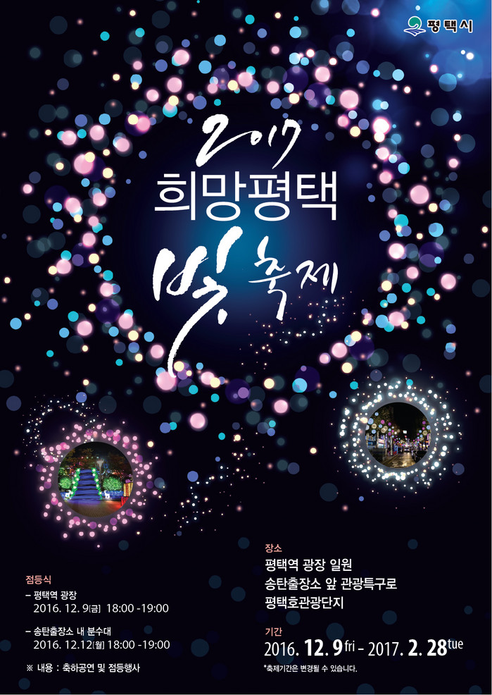 [로컬세계 주덕신 기자]경기 평택시는 2017 희망평택 빛 축제점등식을 오는 9일과 12일 평택역 광장 및 송탄출장소 내 분수대에서 개최한다.