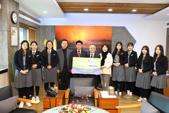 | ▲지난 22일 경명여고 교장, 교사 및 학생들이 북구청을 방문해 이웃돕기성금 142만5700원을 기탁했다.(북구청 제공) |