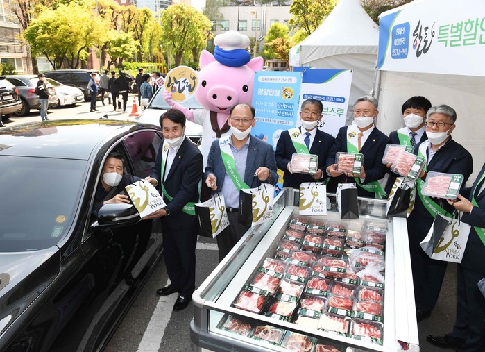 한돈자조금관리위원회(이하 한돈자조금)는 농협경제지주와 함께 오늘 24일, 오후 2시부터 4시까지 2시간 동안 ‘한돈 드라이브스루 할인행사’를 진행했다. 농협서울지역본부 앞에서 열린 이번 행사는 코로나19로 인해 판매가 어려운 축산물 판매 촉진을 위해 기획됐다.