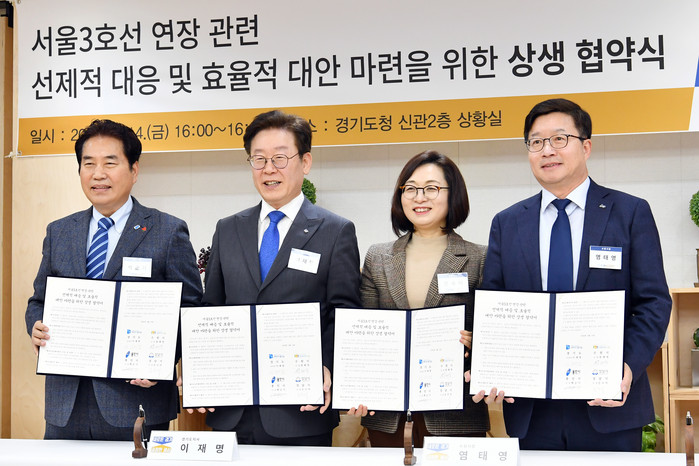 수원시와 경기도, 용인시, 성남시는 14일 오후 4시 경기도청 상황실에서 ‘서울 3호선 연장 관련 선제 대응 및 효율적 대안 마련을 위한 상생 협약’을 맺고 적극적인 협력을 약속했다.