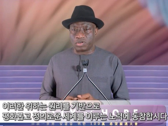 ▲굿럭 조나단 나이지리아 전 대통령이 환영사를 하고 있다. 가정연합 제공 |
