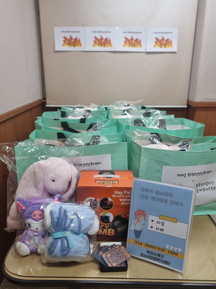 자살 충동이나 습관적 자해로 어려움을 겪는 청소년의 마음 건강을 챙기기 위해, 관내 초·중·고등학교 20개교에 고위기 청소년 상담에 필요한 심리안정화 물품(상담안내서, 셀프 간이진단, 스트레스 해소 카드, 포근한 인형 등)을 제공하고, 청소년상담복지센터 고위기 청소년 지원사업을 홍보했다.