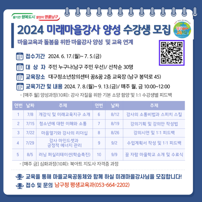 [로컬세계=박세환 기자] 대구 남구는 올해 미래교육지구사업의 일환으로 관내 주민을 대상으로 마을 교육 공동체 활성화를 위한 미래마을 강사 양성 수강생을 모집한다고 26일 밝혔다.