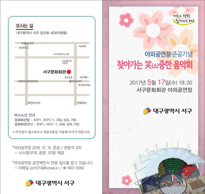 [로컬세계 박세환 기자]대구 서구 문화회관은 오는 17일 오후 6시20분 ‘야외공연장 준공기념 찾아가는 笑(소)중한 음악회’를 개최한다.