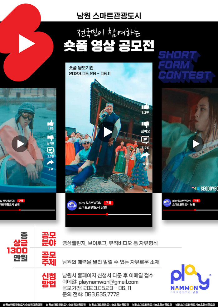 [로컬세계=이태술 기자]전북 남원시는 참신하고 창의적인 아이디어로 남원의 매력을 널리 알려줄 영상 콘텐츠를 발굴해 관광홍보에 활용하기 위한 숏폼 영상 공모전을 개최한다.