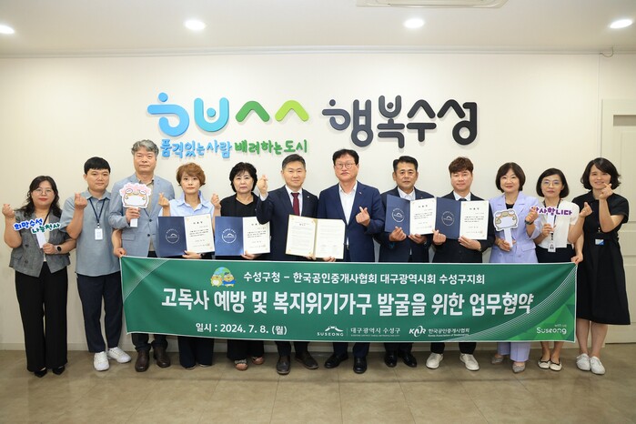 [로컬세계=박세환 기자] 대구 수성구는 지난 8일 한국공인중개사협회 대구지부 수성구지회와 ‘복지위기가구 발굴 및 고독사 예방’을 위한 업무협약을 체결했다.