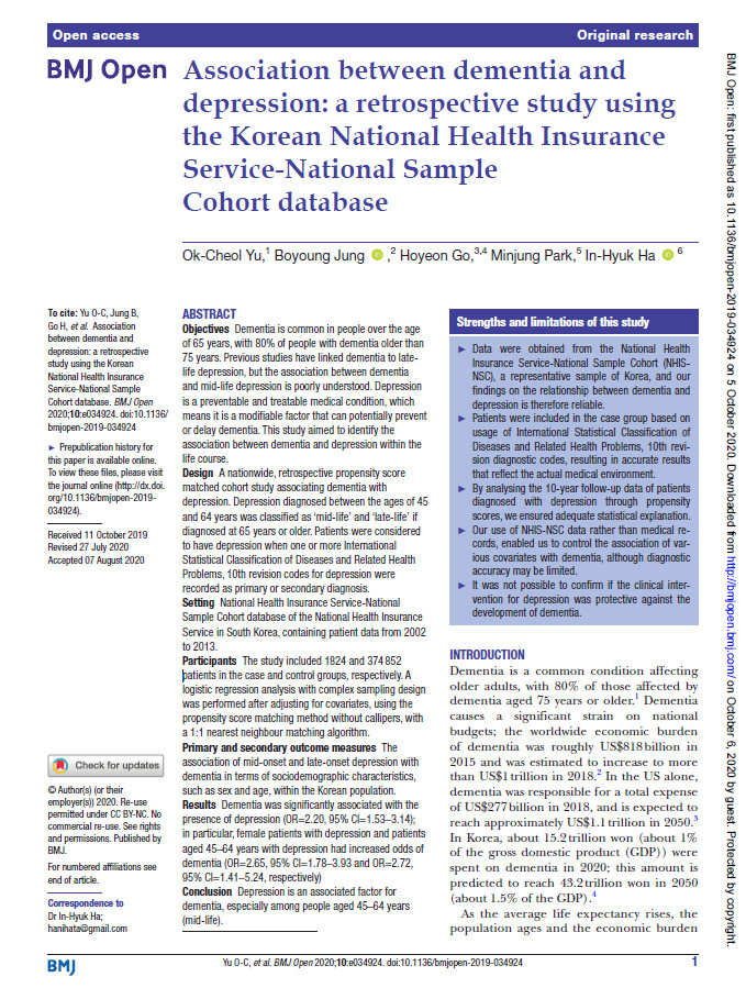▲ ‘BMJ open’ 2020년 10월호에 게재된 해당 연구 논문 「Association between dementia and depression: A retrospective study using the Korean National Health Insurance Service-National Sample Cohort database」 |
