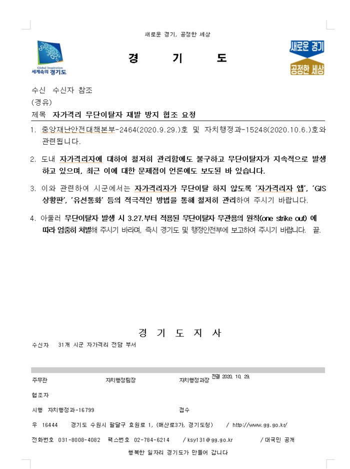 행정기관의 끊임없는 관리에도 자가격리자들의 방역 수칙 미준수사례가 계속되자 경기도가 자가격리 무단이탈자를 대상으로 전원 고발조치라는 특단의 조치를 내렸다.