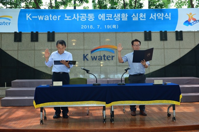 | ▲이학수(좌) 한국수자원공사 사장과 하창원(우) 한국수자원공사 노동조합 위원장이 노사 공동에코생활 실천서약식을 진행했다.(한국수자원공사 제공) |