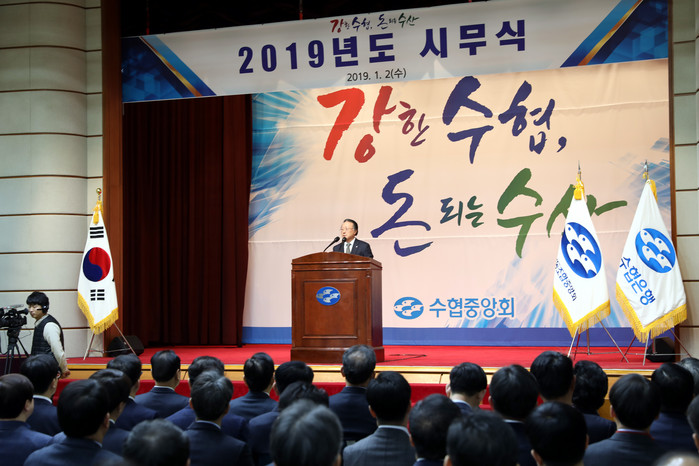 | ▲지난 2일 2019년 시무식에서 임직원들을 격려하고 있는 김임권 수협회장. |