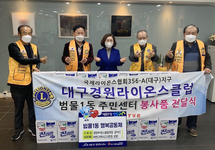 [로컬세계 박세환 기자]대구 경원라이온스클럽(회장 김이수)은 지난 18일 범물1동 행정복지센터를 방문해 동절기를 맞아 어려운 이웃을 위해 써달라며 라면 120박스를 기탁했다.