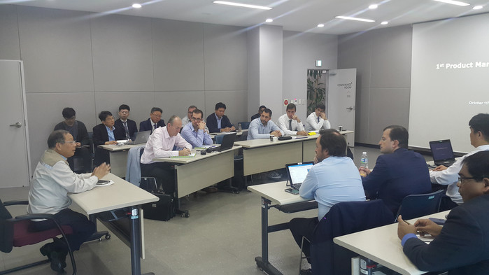 ▲제1회 글로벌제품마케팅협의회 실시, 쌍용차 글로벌 제품 마케팅 협의회가 디자인센터 콘퍼런스룸에서 쌍용자동차 최종식 대표이사(사진 맨 왼쪽)와 미팅을 진행하고 있다.(쌍용자동차 제공) |