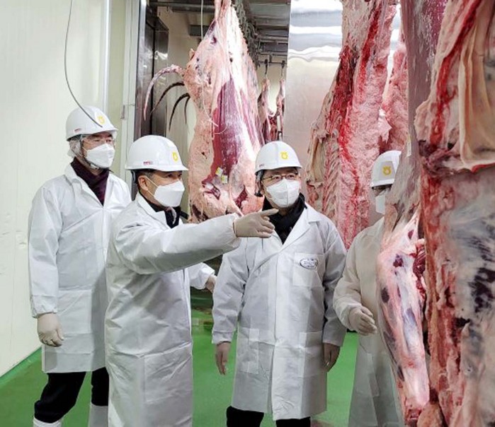 | ▲안병우농협축산경제대표이사(맨 왼쪽)과 김현수 농식품부장관(왼쪽에서 세번째)이 나주축산물공판장에서 수급현황과 위생상태를 점검하고 있다. 농협 제공 |
