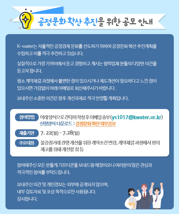 이번 공모는 수자원공사의 계약 관련 절차를 이용하는 외부 협력업체를 비롯해 관심 있는 국민이면 누구나 참여 가능하다.