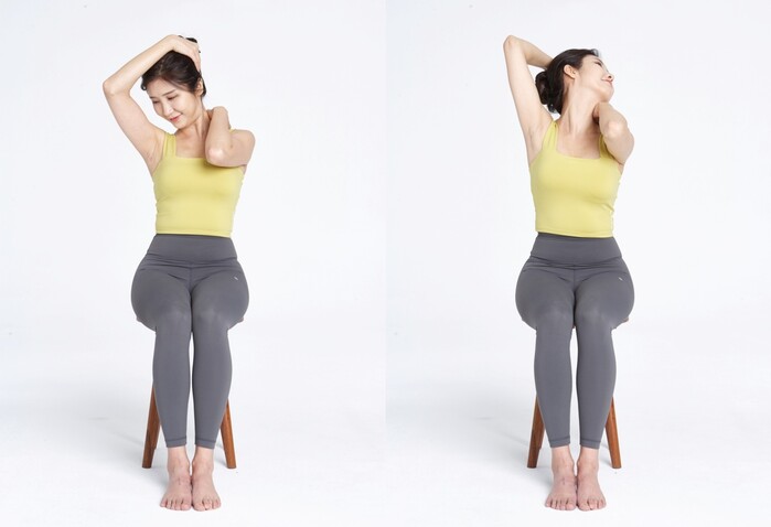과긴장 상태의 목 근육을 이완하는데 효과적인 동작 중 하나로는 ‘견갑거근 스트레칭’이 있다. 먼저 바른 자세로 의자에 앉아 왼손으로 정수리 부근을 감싸고 오른손 검지와 중지로는 날개뼈로부터 한 뼘 위에 위치한 견갑거근을 지긋이 누른다. 이어 고개를 왼쪽 대각선 방향으로 숙여 15초간 자세를 유지한 뒤 다시 고개를 오른쪽으로 돌려 천천히 뒤로 젖힌다. 반대쪽도 동일하게 총 3회씩 3세트를 반복하면 목 주변 근육의 긴장이 풀리며 움직임이 한결 편안해진다.