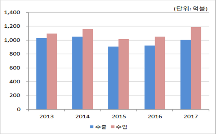 26일 관세청은 '2017년 중소기업 수출입 현황'을 발표하면서 중소기업 수출액은 1008억 달러, 수입액은 1189억 달러로 전체 기업 수입액의 25.2%를 차지했다고 밝혔다.