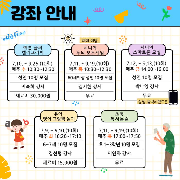 어린이를 대상으로 하는 강좌는 영어 그림책을 통해 언어 능력을 향상시킬 수 있는 "유아 영어 그림책 놀이”와 다양한 주제의 독서와 논술 연습을 통해 글쓰기 능력을 향상시키는 "초등 독서 논술”이 개설된다.