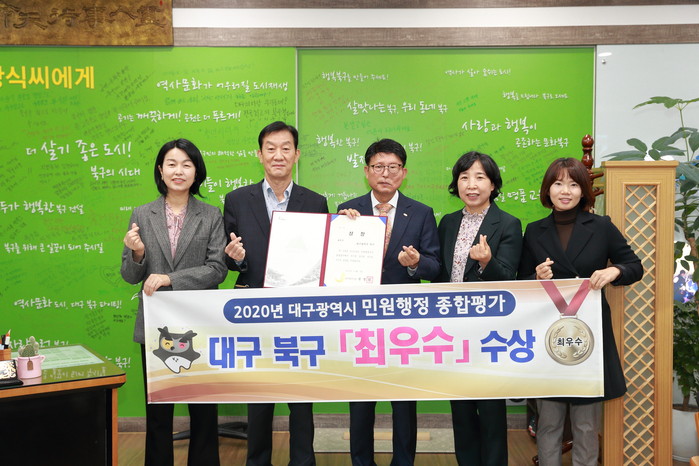 또 2017년 행정안전부 국민행복민원실 최우수기관으로 선정된 북구는 올해 민원실 환경을 개선하고 서비스 수준을 향상해 다시 찾고 싶은 편안한 민원실을 조성했으며, 2016년부터 5년 연속 대구시 민원행정 평가 우수, 최우수기관에 선정되는 쾌거를 이루었다.