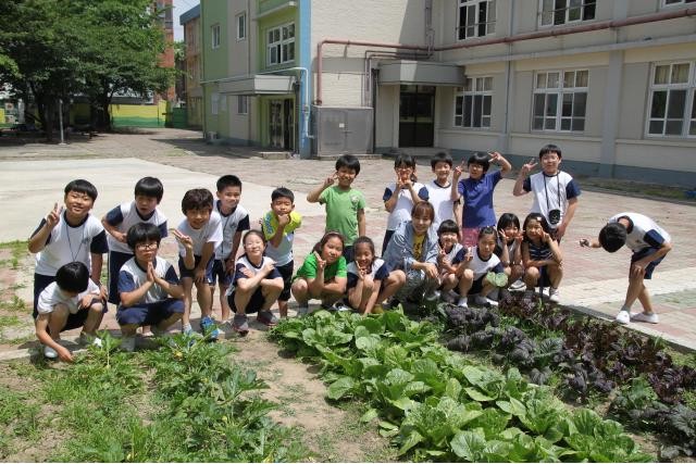 | ▲대구시 한 초등학교에서 아이들이 직접 가꾼 텃밭에서 기념촬영을 하고 있다. |