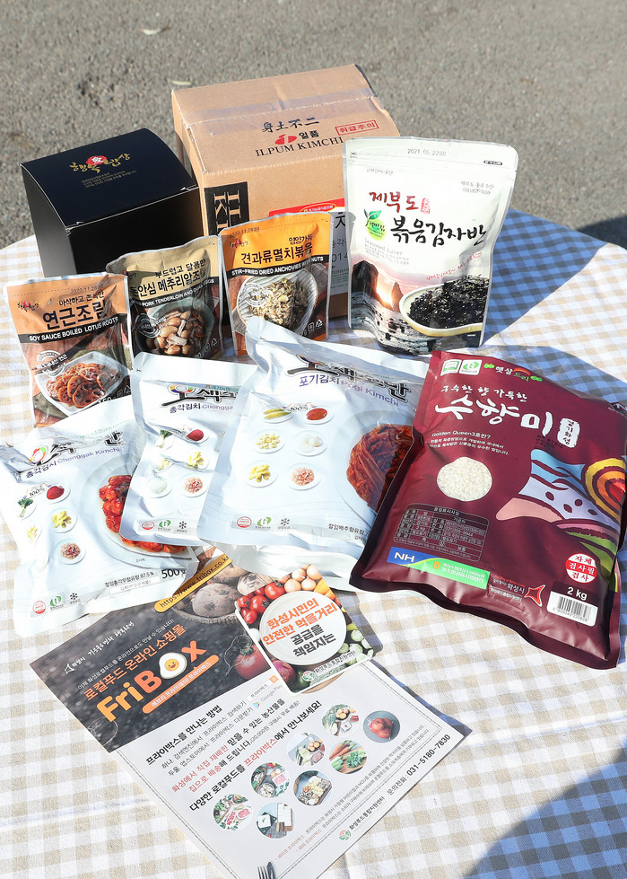 꾸러미에는 수향미 2kg, 포기김치와 총각김치 각 1kg, 메추리알, 멸치, 연근조림 등 반찬 3종, 김자반이 담겼다.