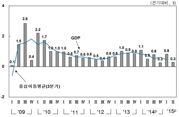 건설투자가 증가세를 이어갔으나, 메르스 및 가뭄의 영향으로 민간소비와 수출이 감소하면서 성장률은 5분기 연속 0%대의 낮은 성장률을 지속했다.