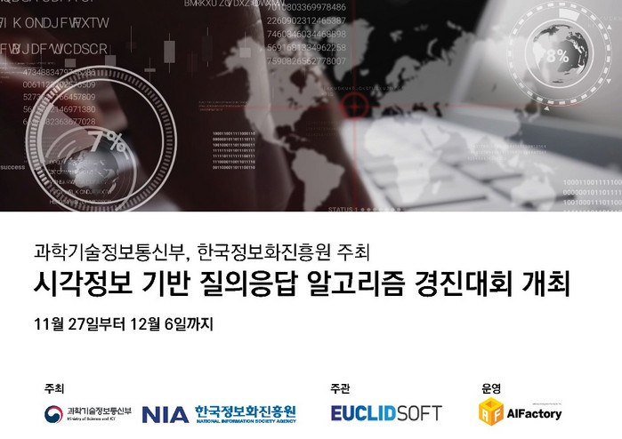 과학기술정보통신부와 한국정보화진흥원이 주최하고 유클리드소프트가 주관하는 ‘시각정보 기반 질의응답 알고리즘 경진대회’는 이미지를 보면 떠오르는 많은 질문에 대해 꼭 맞는 답을 찾아내는 알고리즘을 개발하는 대회다. 이를 개발하기 위해서는 이미지에 대한 이해와 인간의 언어 등 상관관계를 파악하는 기술이 필요하다.