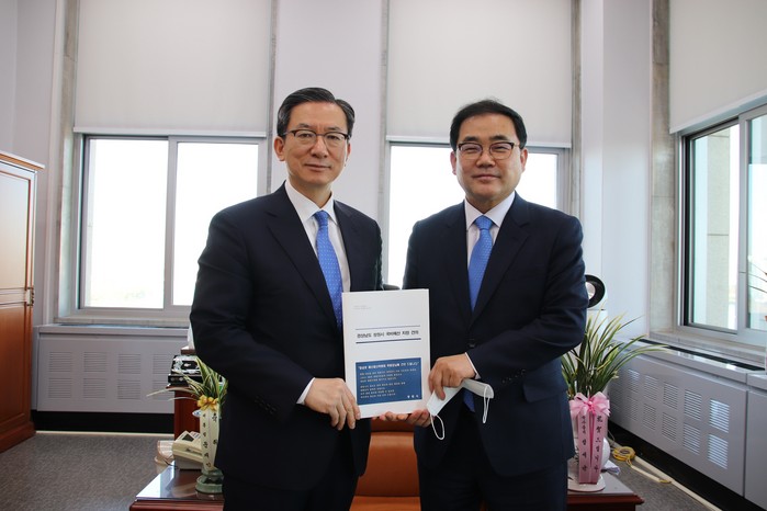 ▲허성무 창원시장(왼쪽)이 송갑석 산업통상자원중소벤처기업위원회 간사와 기념촬영을 하고 있다. |