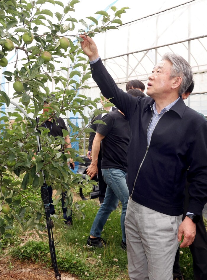 ▲강호동 농협중앙회장이 12일 강원도 철원 사과 농가를 방문하여 생육상황을 점검하고 있다. 농협 제공 |