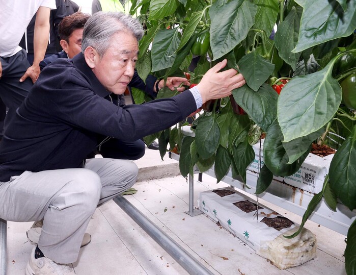 ▲강호동 농협중앙회장이 12일 강원도 철원 파프리카 농가를 방문하여 생육상황을 점검하고 있다. |