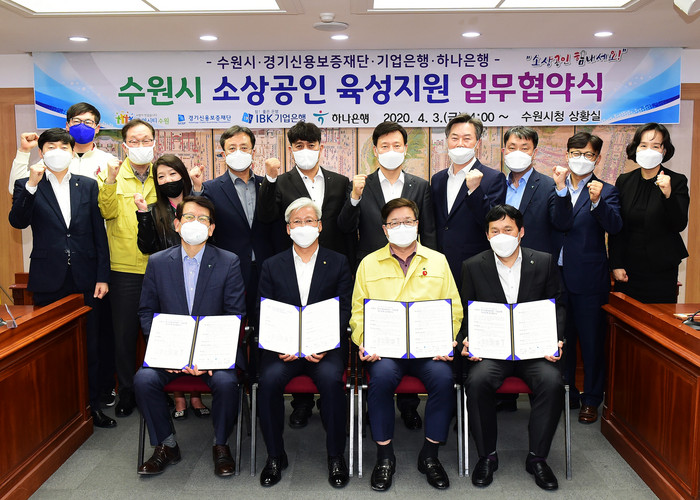 수원시는 3일 오후 2시 수원시청 상황실에서 ‘수원시 소상공인 육성지원 업무 협약식’을 열고 경기신용보증재단 및 기업은행, 하나은행 등과 소상공인 경영안정 지원에 뜻을 모았다.