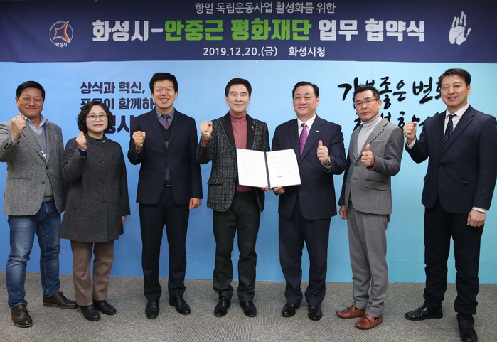 협약식에는 서철모 화성시장, 이진학 안중근평화재단 이사장 등 6명이 참여해 협약서 낭독 및 서명, 기념촬영 등 행사를 함께 했다.