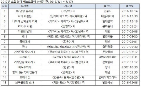 ▲올해 소설 베스트셀러 누적 순위. |