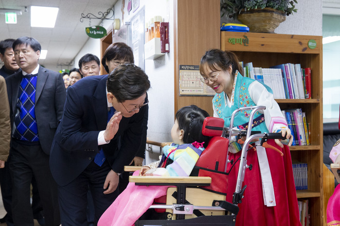 한복을 차려입은 시설 입소 장애인들과 일일이 만나며 새해 덕담을 나누던 이 지사는 단체로 ‘맞세배’를 하며 명절 분위기를 돋웠다.