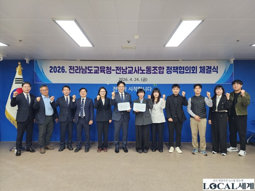 [로컬세계 = 김명진 기자]전라남도교육청과 전남교사노동조합(위원장 김신안)은 24일 전라남도교육청 중회의실에서 ‘2026년도 정책협의회 체결식’을 갖고, 건강한 교육 생태계 조성을 위한 공동의 노력을 약속했다.