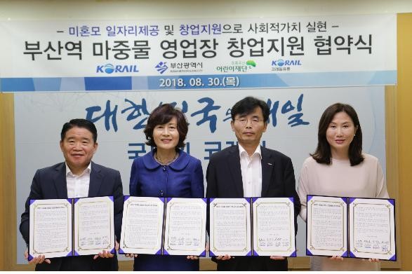 [로컬세계 맹화찬 기자]코레일 부산경남본부는 30일 오후 2시 부산역 5층 본부 회의실에서 부산광역시, 코레일유통 부산경남본부, 초록우산어린재단 부산지역본부와 ‘미혼모 마중물 영업장 창업지원 업무협약(MOU)’을 체결 하였다고 밝혔다.