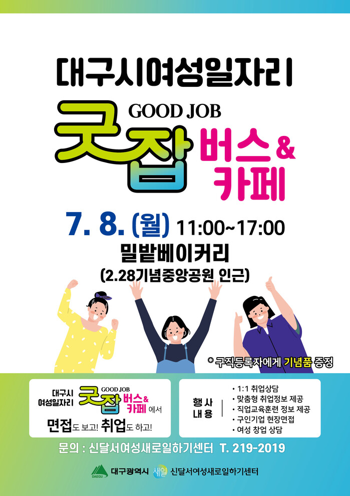 ‘굿잡(Good Job) 카페’ 행사는 직접 찾아가는 여성 취업지원 서비스로, 취업을 희망하는 여성 누구나 참여 가능하며 구직상담, 채용알선, 현장면접, 취업정보제공 등이 진행된다.