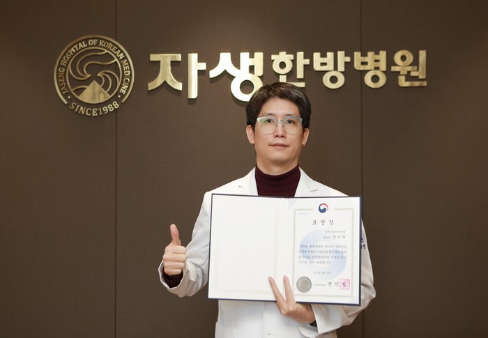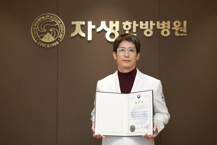 ▲자생한방병원 척추관절연구소 하인혁 소장이 보건복지부장관으로부터 표창장을 수상했다. |