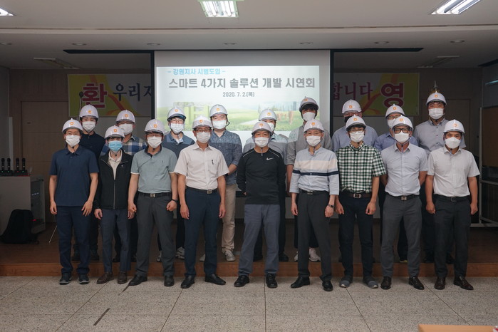 | ▲2일 농협사료 관계자들이 강원지사에서 스마트 4가지 솔루션 자체 개발시연회 뒤 기념촬영을 하고 있다.(농협사료 제공) |